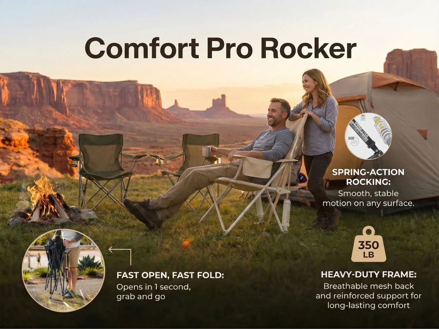 Patented spring-action absorbers deliver gentle, stable rocking on any surface. A 350-lb steel frame, breathable mesh seating, and a built-in cup holder provide comfort that lasts.